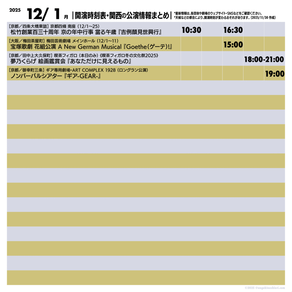 2025年12月1日(月)の公演情報 2025.12.01 ▼各公演のリンク先(初回上演時刻が早い順) 松竹創業百三十周年 京の年中行事 當る午歳『吉例顔見世興行』 宝塚歌劇 花組公演 A New German Musical『Goethe(ゲーテ)!』 《喫茶フィガロ冬の文化祭2025》夢乃くらげ 絵画鑑賞会『あなただけに見えるもの』 ノンバーバルシアター『ギア-GEAR-』