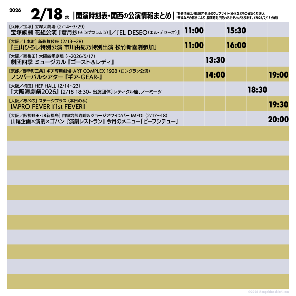 2026年2月18日(水)の公演情報 2026.02.172026.02.18 ▼最新情報は、各公演のリンク先にてご確認ください 宝塚歌劇 花組公演 グランド・ラメント『蒼月抄(そうげつしょう)』-平家終焉の契り-/スパイシー・ショー『EL DESEO(エル・デセーオ)』 『三山ひろし特別公演 市川由紀乃特別出演 松竹新喜劇参加』 劇団四季 ミュージカル『ゴースト&レディ』 ノンバーバルシアター『ギア-GEAR-』 『大阪演劇祭2026』 IMPRO FEVER『1st FEVER』 山尾企画×演劇×ゴハン『演劇レストラン』今月のメニュー「ビーフシチュー」