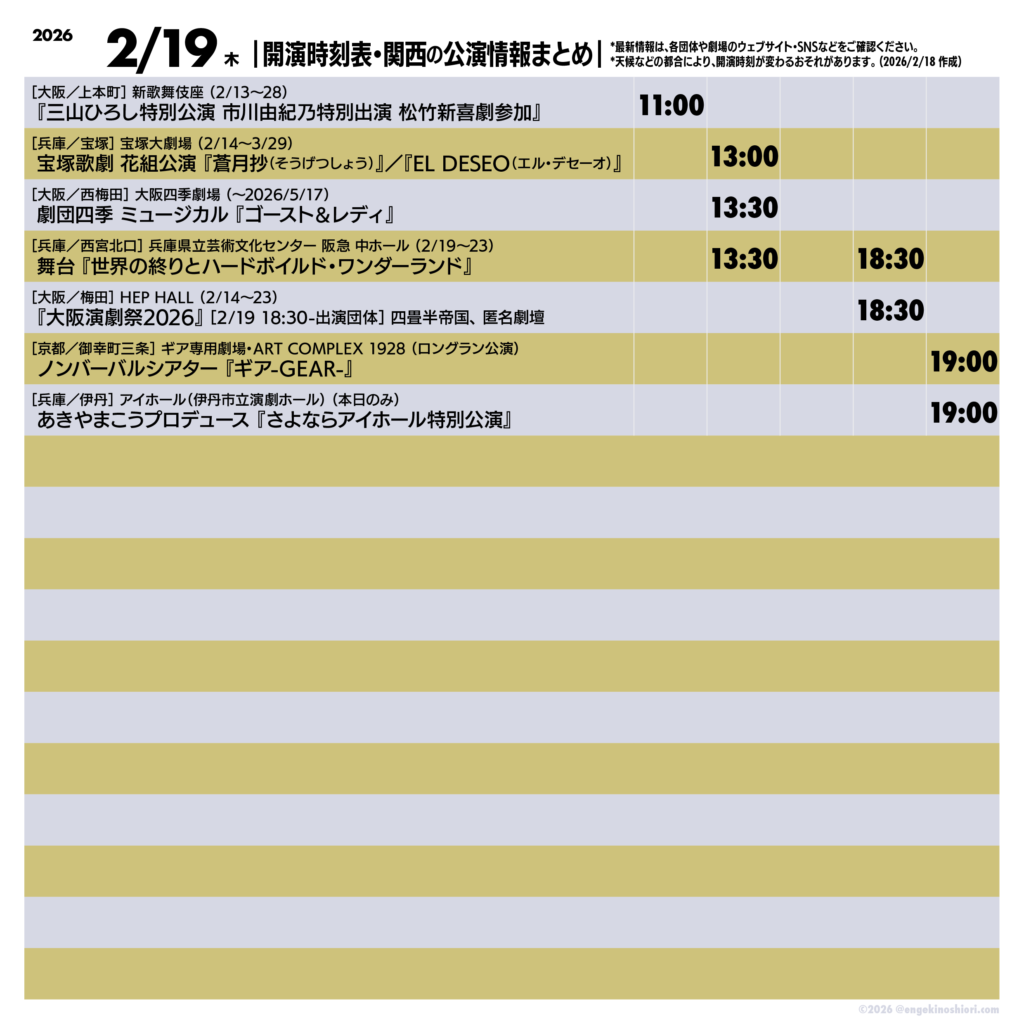 2026年2月19日(木)の公演情報 2026.02.18 ▼最新情報は、各公演のリンク先にてご確認ください 『三山ひろし特別公演 市川由紀乃特別出演 松竹新喜劇参加』 宝塚歌劇 花組公演 グランド・ラメント『蒼月抄(そうげつしょう)』-平家終焉の契り-/スパイシー・ショー『EL DESEO(エル・デセーオ)』 劇団四季 ミュージカル『ゴースト&レディ』 舞台『世界の終りとハードボイルド・ワンダーランド』 『大阪演劇祭2026』 ノンバーバルシアター『ギア-GEAR-』 あきやまこうプロデュース『さよならアイホール特別公演』