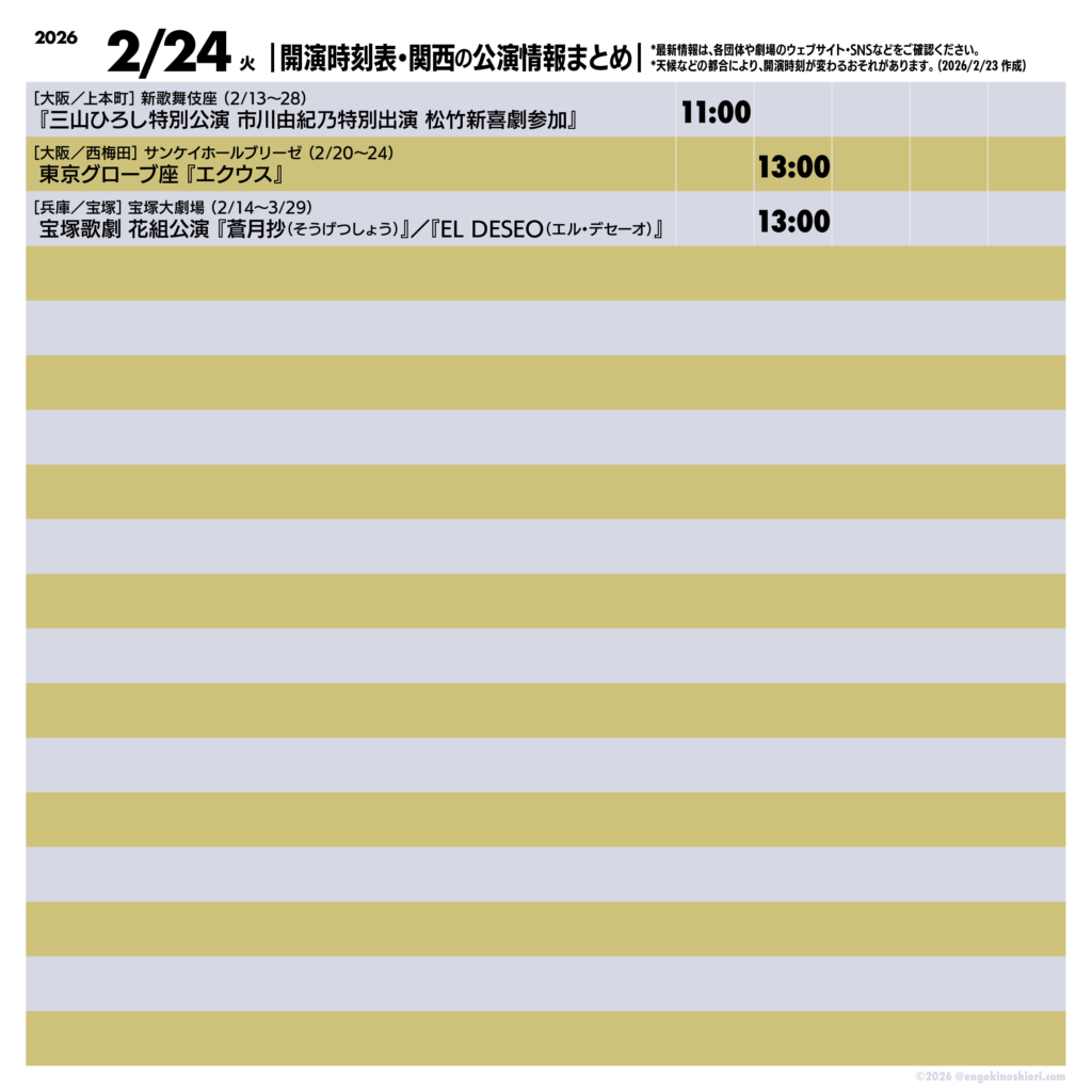 2026年2月24日(火)の公演情報 2026.02.24 ▼最新情報は、各公演のリンク先にてご確認ください 『三山ひろし特別公演 市川由紀乃特別出演 松竹新喜劇参加』 東京グローブ座『エクウス』 宝塚歌劇 花組公演 グランド・ラメント『蒼月抄(そうげつしょう)』-平家終焉の契り-/スパイシー・ショー『EL DESEO(エル・デセーオ)』