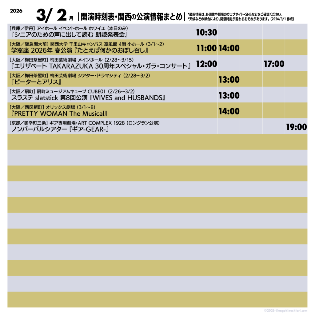 2026年3月2日(月)の公演情報 2026.03.02 ▼最新情報は、各公演のリンク先にてご確認ください 『シニアのための声に出して読む 朗読発表会』 学窓座 2026年 春公演『たとえば何かのおぼし召し』 『エリザベート TAKARAZUKA 30周年スペシャル・ガラ・コンサート』 『ピーターとアリス』 スラステ slatstick 第8回公演『WIVES and HUSBANDS』ワイヴズ アンド ハズバンズ 『PRETTY WOMAN The Musical』 ノンバーバルシアター『ギア-GEAR-』