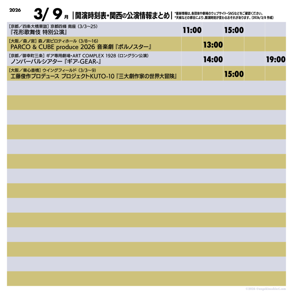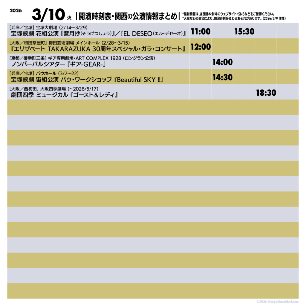 2026年3月10日(火)の公演情報 2026.03.10 ▼最新情報は、各公演のリンク先にてご確認ください 宝塚歌劇 花組公演 グランド・ラメント『蒼月抄(そうげつしょう)』-平家終焉の契り-/スパイシー・ショー『EL DESEO(エル・デセーオ)』 『エリザベート TAKARAZUKA 30周年スペシャル・ガラ・コンサート』 ノンバーバルシアター『ギア-GEAR-』 宝塚歌劇 宙組公演 バウ・ワークショップ『Beautiful SKY !!』 劇団四季 ミュージカル『ゴースト&レディ』