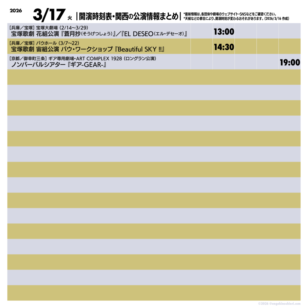 2026年3月17日(火)の公演情報 2026.03.17 ▼最新情報は、各公演のリンク先にてご確認ください 宝塚歌劇 花組公演 グランド・ラメント『蒼月抄(そうげつしょう)』-平家終焉の契り-/スパイシー・ショー『EL DESEO(エル・デセーオ)』 宝塚歌劇 宙組公演 バウ・ワークショップ『Beautiful SKY !!』 ノンバーバルシアター『ギア-GEAR-』