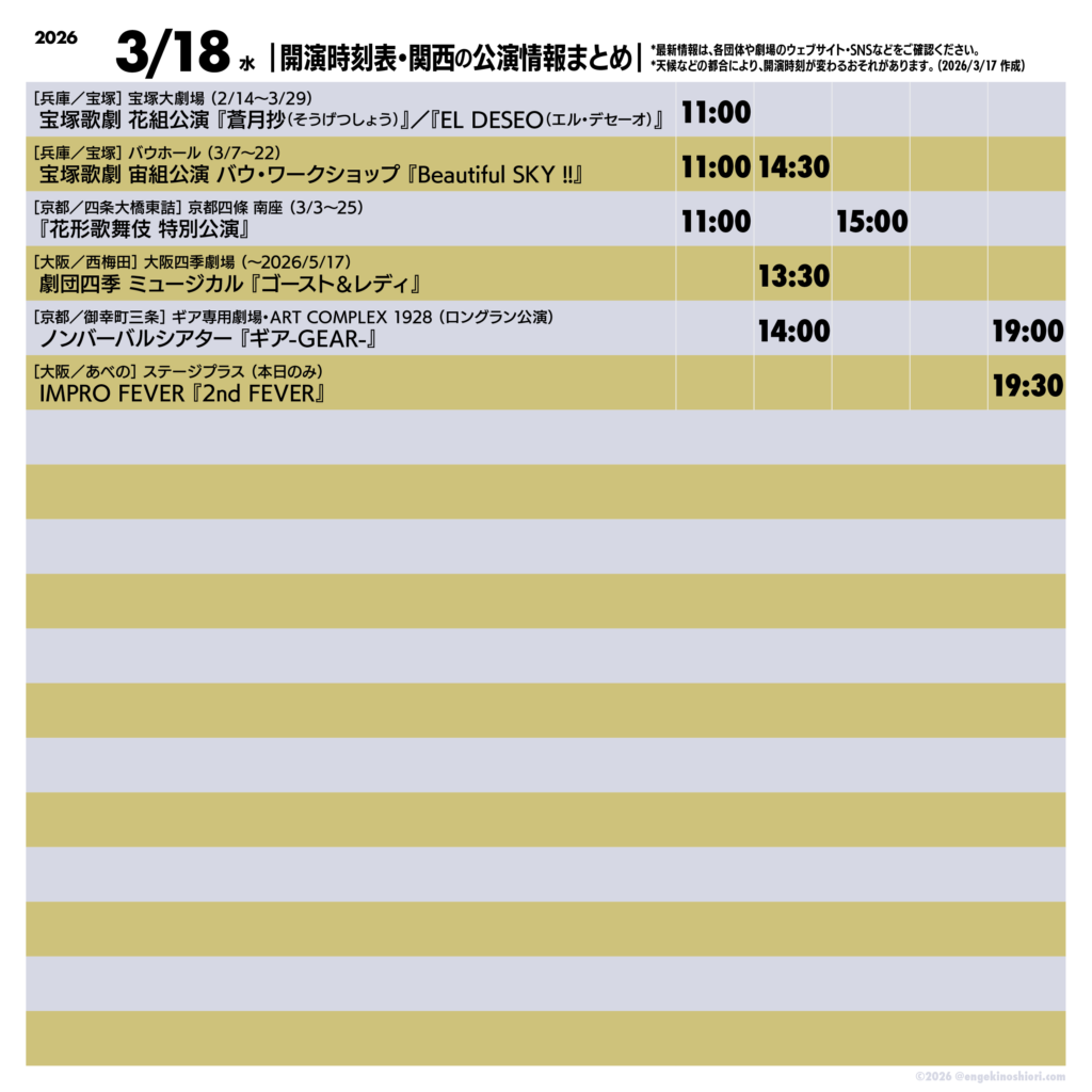2026年3月18日(水)の公演情報 2026.03.18 ▼最新情報は、各公演のリンク先にてご確認ください 宝塚歌劇 花組公演 グランド・ラメント『蒼月抄(そうげつしょう)』-平家終焉の契り-/スパイシー・ショー『EL DESEO(エル・デセーオ)』 宝塚歌劇 宙組公演 バウ・ワークショップ『Beautiful SKY !!』 『花形歌舞伎 特別公演』 劇団四季 ミュージカル『ゴースト&レディ』 ノンバーバルシアター『ギア-GEAR-』 IMPRO FEVER『2nd FEVER』