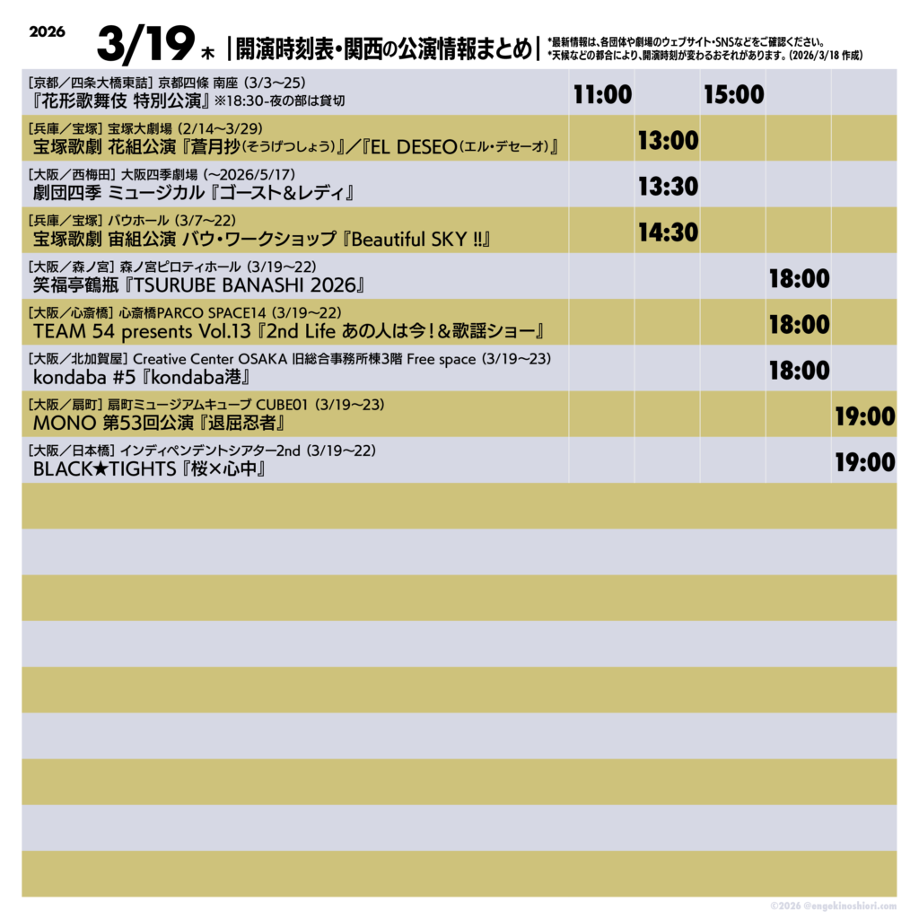 2026年3月19日(木)の公演情報 2026.03.19 ▼最新情報は、各公演のリンク先にてご確認ください 『花形歌舞伎 特別公演』 宝塚歌劇 花組公演 グランド・ラメント『蒼月抄(そうげつしょう)』-平家終焉の契り-/スパイシー・ショー『EL DESEO(エル・デセーオ)』 劇団四季 ミュージカル『ゴースト&レディ』 宝塚歌劇 宙組公演 バウ・ワークショップ『Beautiful SKY !!』 笑福亭鶴瓶『TSURUBE BANASHI 2026』 TEAM 54 presents Vol.13『2nd Life あの人は今!&歌謡ショー』 kondaba #5『kondaba港』 MONO 第53回公演『退屈忍者』 BLACK★TIGHTS『桜×心中』